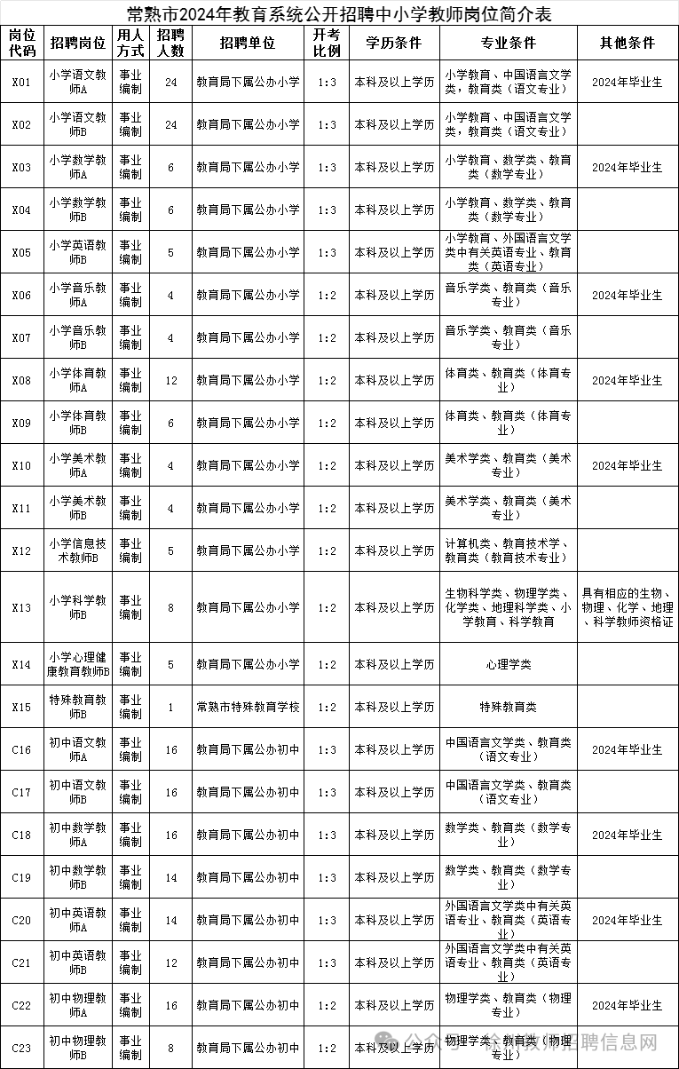 详见附件《常熟市2024年教育系统公开招聘中小学教师岗位简介表》。