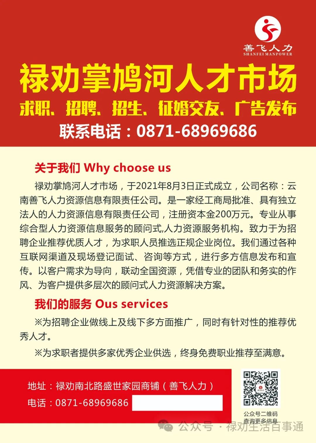 公司地址:禄劝南北路盛世家园商铺(善飞人力)