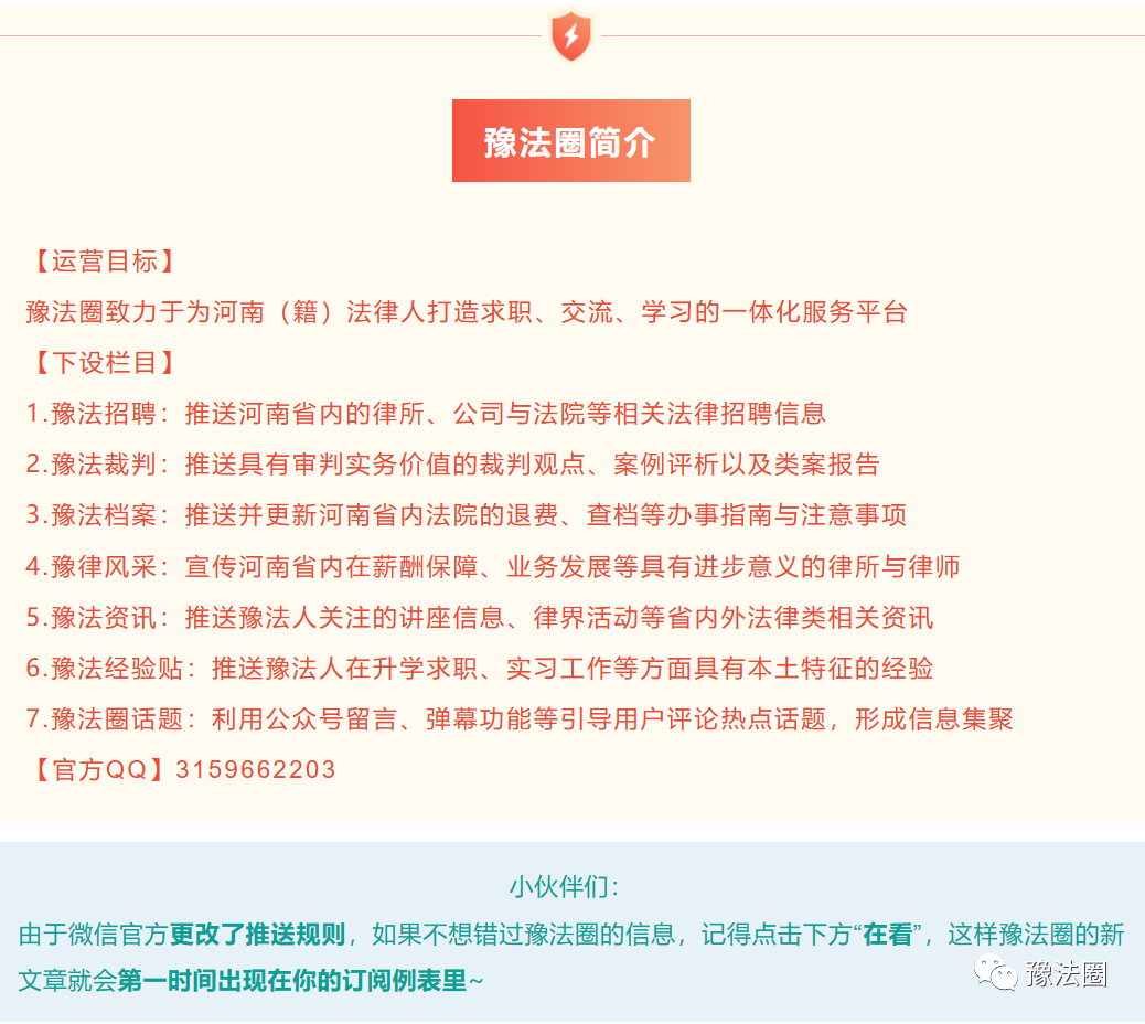 【栏目内容】定期推送河南省内的法律类招聘信息,建立求职避雷QQ匿名交流群,助力豫法人招聘求职。