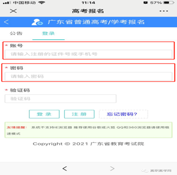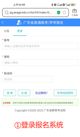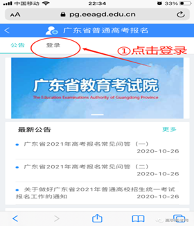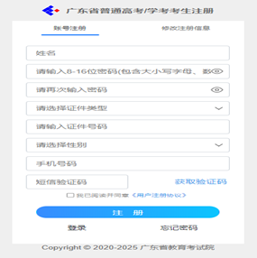 (一)考生注册。考生应先进入广东省普通高考报名系统(网址为:https://pg.eeagd.edu.cn/ks),凭姓名、证件号注册考生账号,设置密码,并绑定手机号。