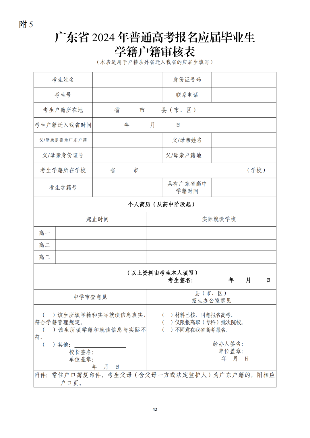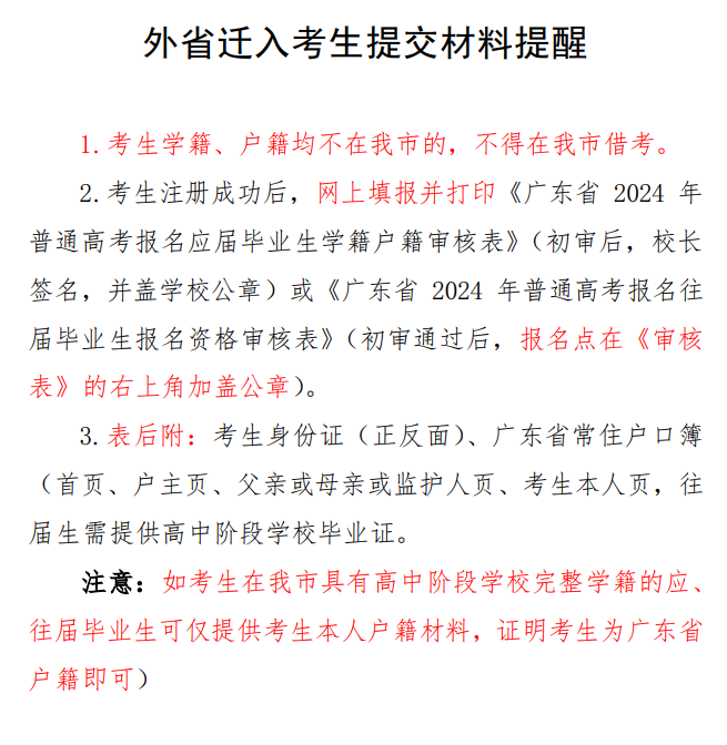 (四)确认报名。网上报名完成后,考生还须在规定时间内持二代(或三代)身份证、户口簿、学籍学历等证明材料到市县招生办公室指定的报名点办理确认报名手续。确认报名手续包括确认报名资格、校对和核准报考信息等。具体报名办法按《广东省2024年普通高校招生统一考试报名实施细则》(粤招〔2023〕7号文附件1附4)进行。