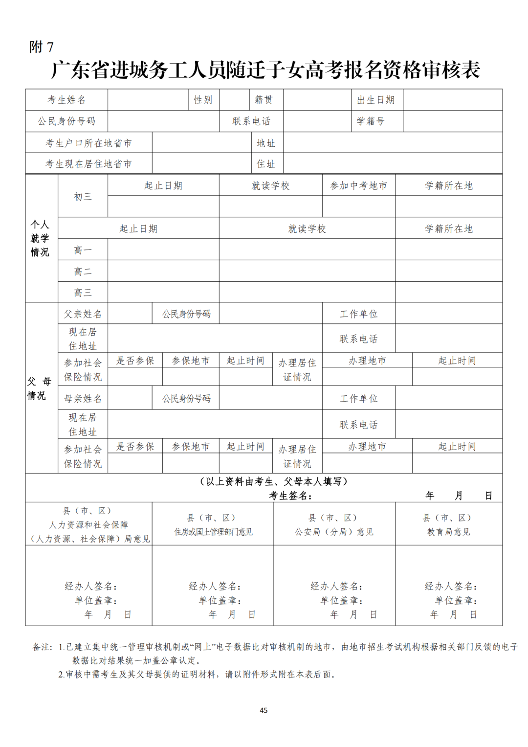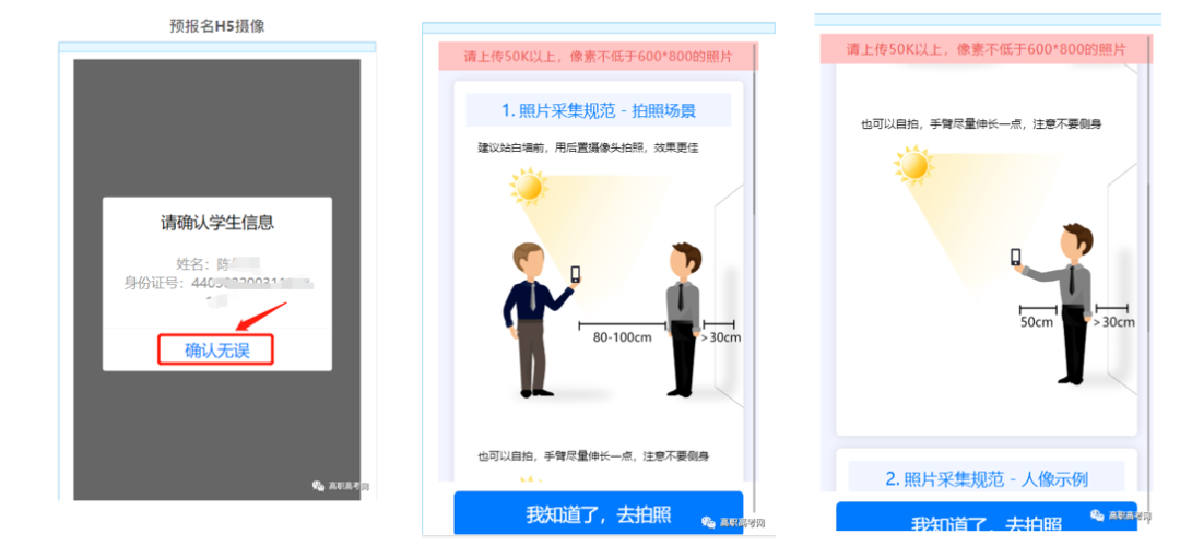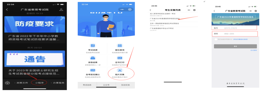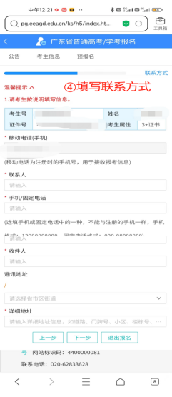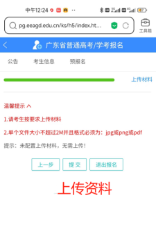 (三)网上报名。凭考生号和注册时设置的密码登录广东省普通高考报名系统进行网上报名。网上报名时,考生须认真阅读报考须知,签订《考生诚信考试承诺书》(附件3),并按系统指引,录入本人的基本信息(含普通高中学业水平考试选择考科目在内的报考信息、联系方式、个人简历、家庭情况等),上传身份证、户口簿等身份证明材料(其中身份证号44开头的广东户籍考生如经报名系统核查户籍信息验证通过的,无需上传),采集和上传相片,并交纳报考费。上传的报名材料支持JPG/PNG/PDF文件格式,大小不超过2M,其中身份证要求上传正反两面、户口簿要求上传首页、户主页、父/母亲或监护人页、考生本人页,考生可提前准备好电子文档,方便报名时上传。