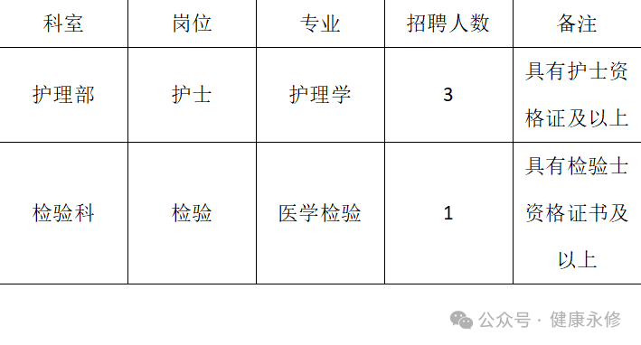 永修县江上乡卫生院因业务发展及人才需要,拟面向社会公开招聘护士、检验等专业技术人员4名,现将有关事项公告如下: