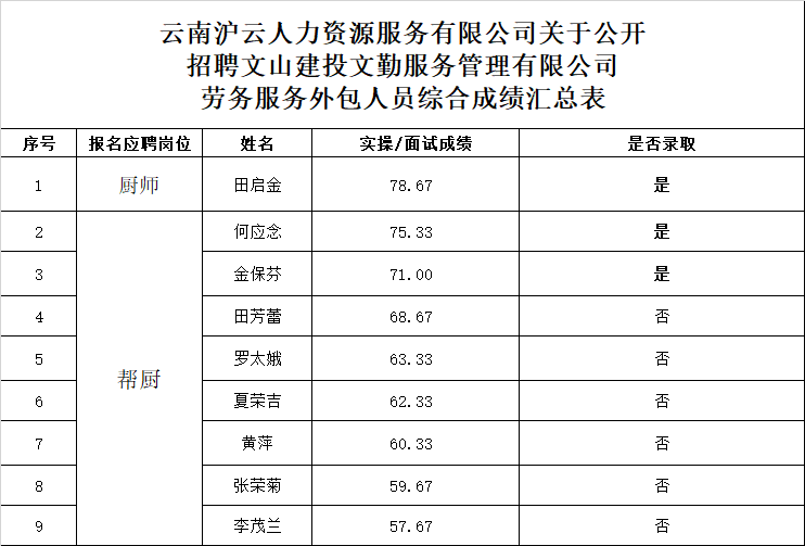 附件:云南沪云人力资源服务有限公司关于公开招聘文山建投文勤服务管理有限公司劳务服务外包人员成绩汇总表