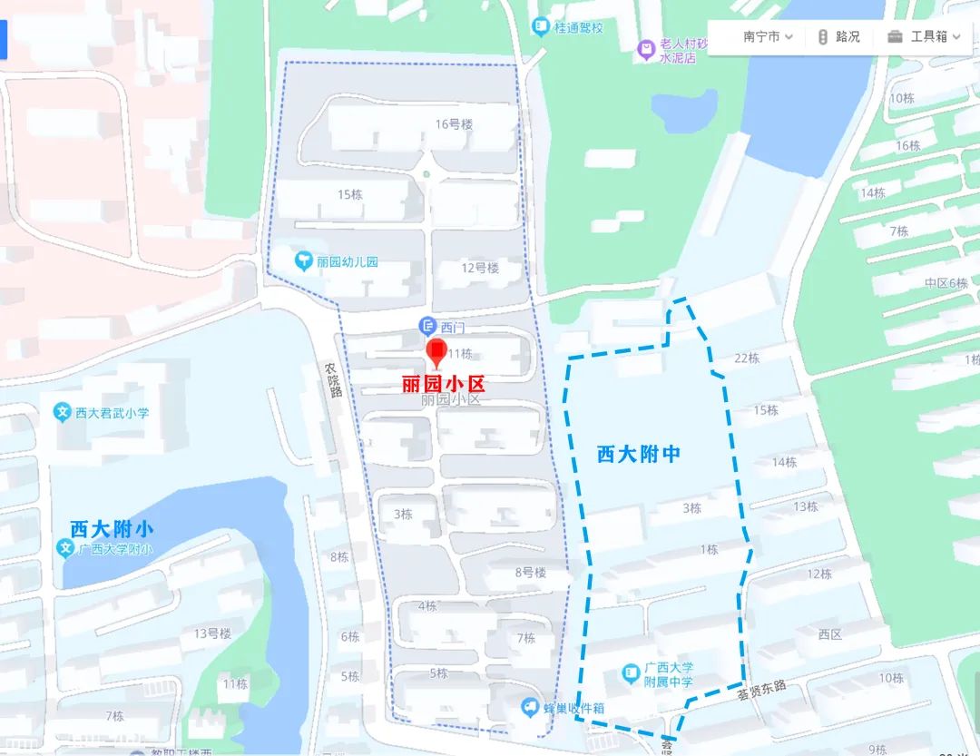 因为西大附中转公给了周边校区可以入读名校的机会,这其中当属丽园小区的优势最为明显:小区和西大附中一墙之隔,是和西大附中最近的小区,根据南宁市「就近入学」的原则最有可能划读。