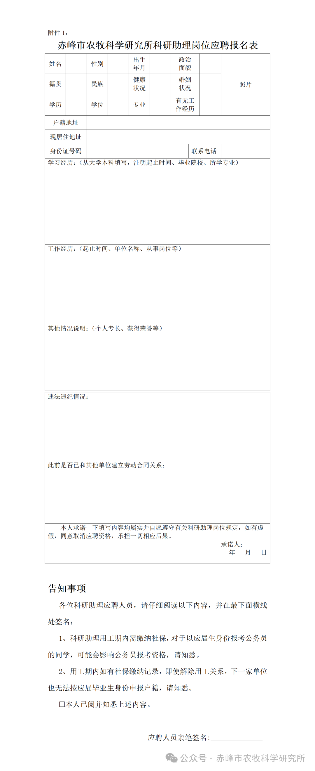 本次招聘采取线上报名的方式进行。自公告发布之日起,凡《赤峰市农牧科学研究所招聘科研助理的公告》中符合招聘条件和岗位要求的人员须下载填写《赤峰市农牧科学研究所科研助理岗位应聘报名表》(附件1),于2024年2月26日8:30至3月1日17:30期间,将报名表与学历学位证书等必要佐证材料一并发送至电子邮箱(邮箱:cfnksrs@163.com)。报名邮件发送后,报名人员要与招聘单位联系确认报名成功。超过报名截止时间的,不再接收报名表。