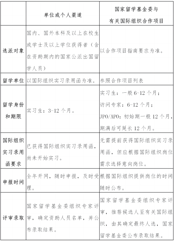 答:国际组织实习项目包括两个申报渠道:单位或个人渠道和国家留学基金委与有关国际组织合作项目,区别如下: