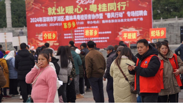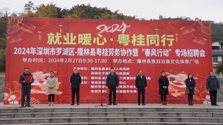 一年之计在于春,春季求职招聘迎来了高峰期,为全面贯彻落实省、市、区高质量发展大会精神, 巩固拓展脱贫攻坚成果和乡村振兴有效衔接,进一步加大城乡稳就业工作力度,提升粤桂劳务协作服务水平,促进城乡劳动力就近就业、转移就业,全力帮助返乡农民工、就业困难人员、高校毕业生等群体找到工作,为企业和求职者提供精准高效的就业服务。2月27日,罗湖人力资源局抢抓春节后用工需求的“井喷期”,赴广西隆林县开展2024年深圳市罗湖区· 隆林县粤桂劳务协作暨“春风行动”专场招聘会,把岗位送到群众家门口。粤桂协作工作队隆林工作组组长柳通,深圳市罗湖区人力资源局公共就业促进中心主任张培军以及隆林各族自治县人力资源和社会保障局、隆林各族自治县教育局等单位分管领导出席本次活动。
