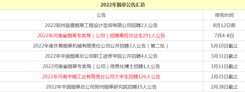 现已步入2024年度,烟草系统招录已有发布的迹象,许昌烟草率先发布(私聊小编查看公告原文)根据近两年政策,预计23-24届同学均可报考。以下为往年招聘时间,我们可从往年时间预估今年招聘时间,一般河南烟草在3月份发布公告,大家可以提前做好相关准备。