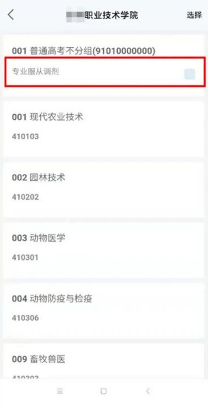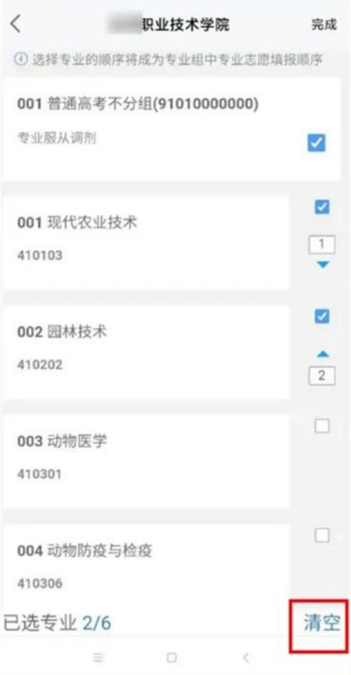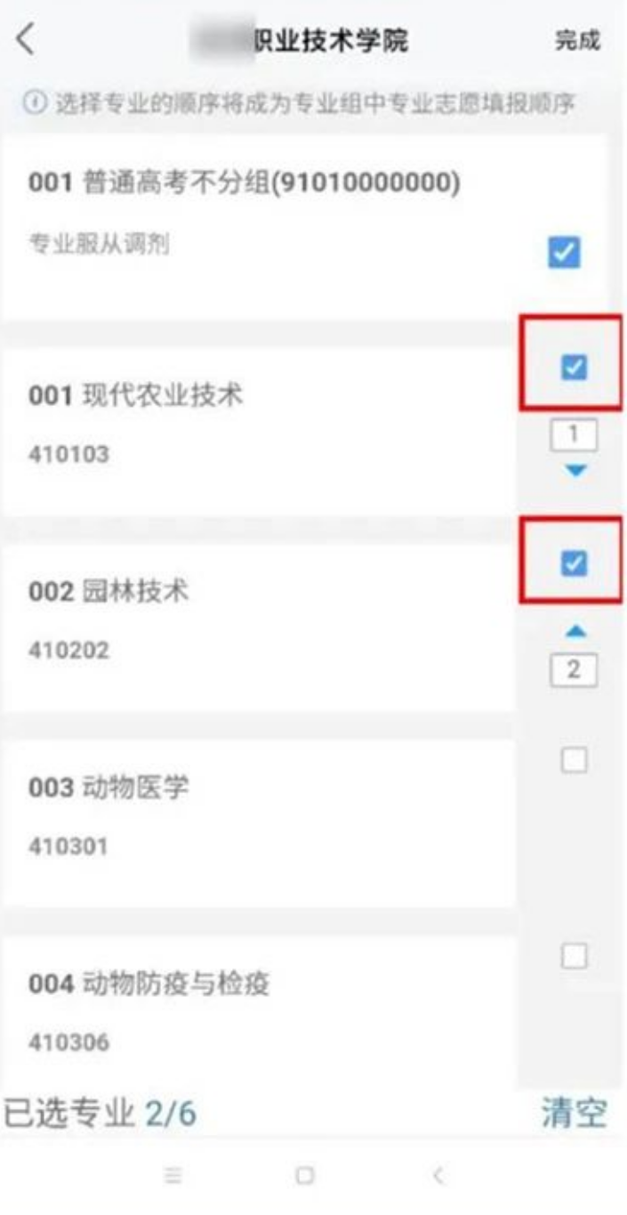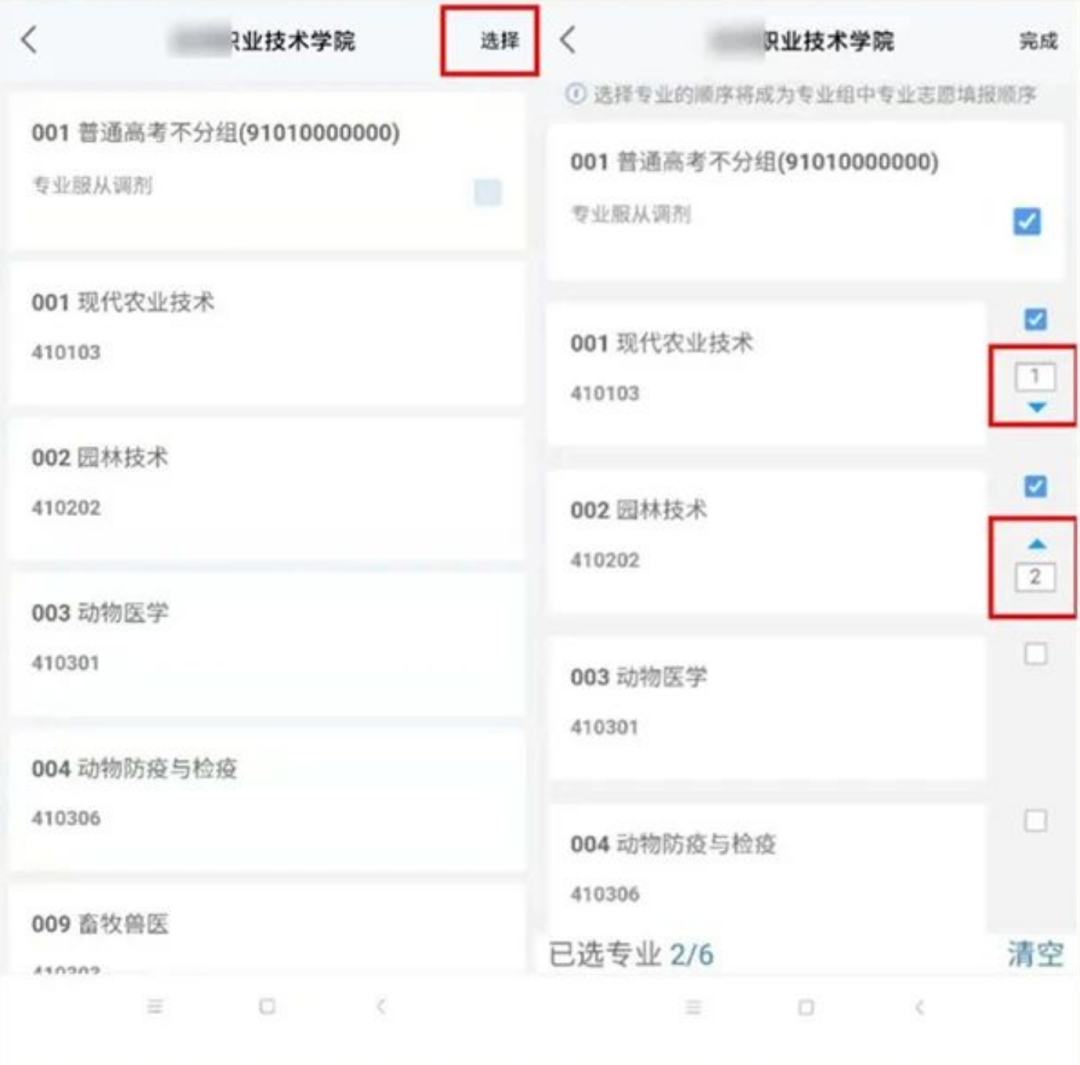点击已填报的院校专业组,可进入专业编辑。点击右上角【选择】后,可输入专业志愿序号或使用箭头标签上下移动,进行专业排序。