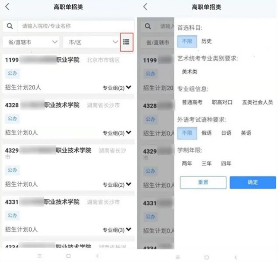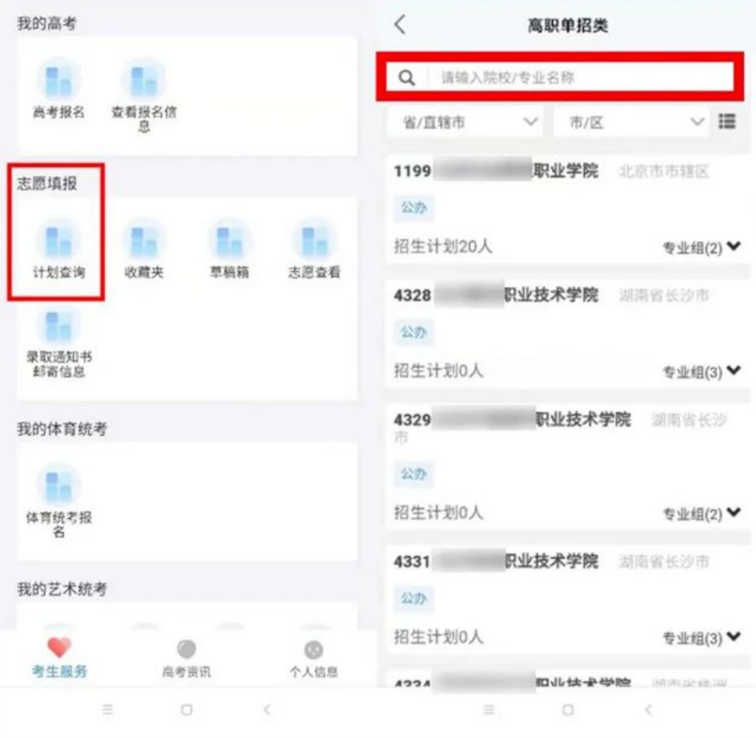 7.通过【志愿填报】→【计划查询】,查询可填报的高职单招院校专业组计划。