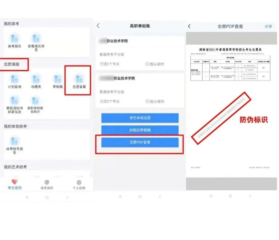 12.考生可点击【志愿查看】→【预览】,查看和打印带防伪标识的“考生志愿表”。