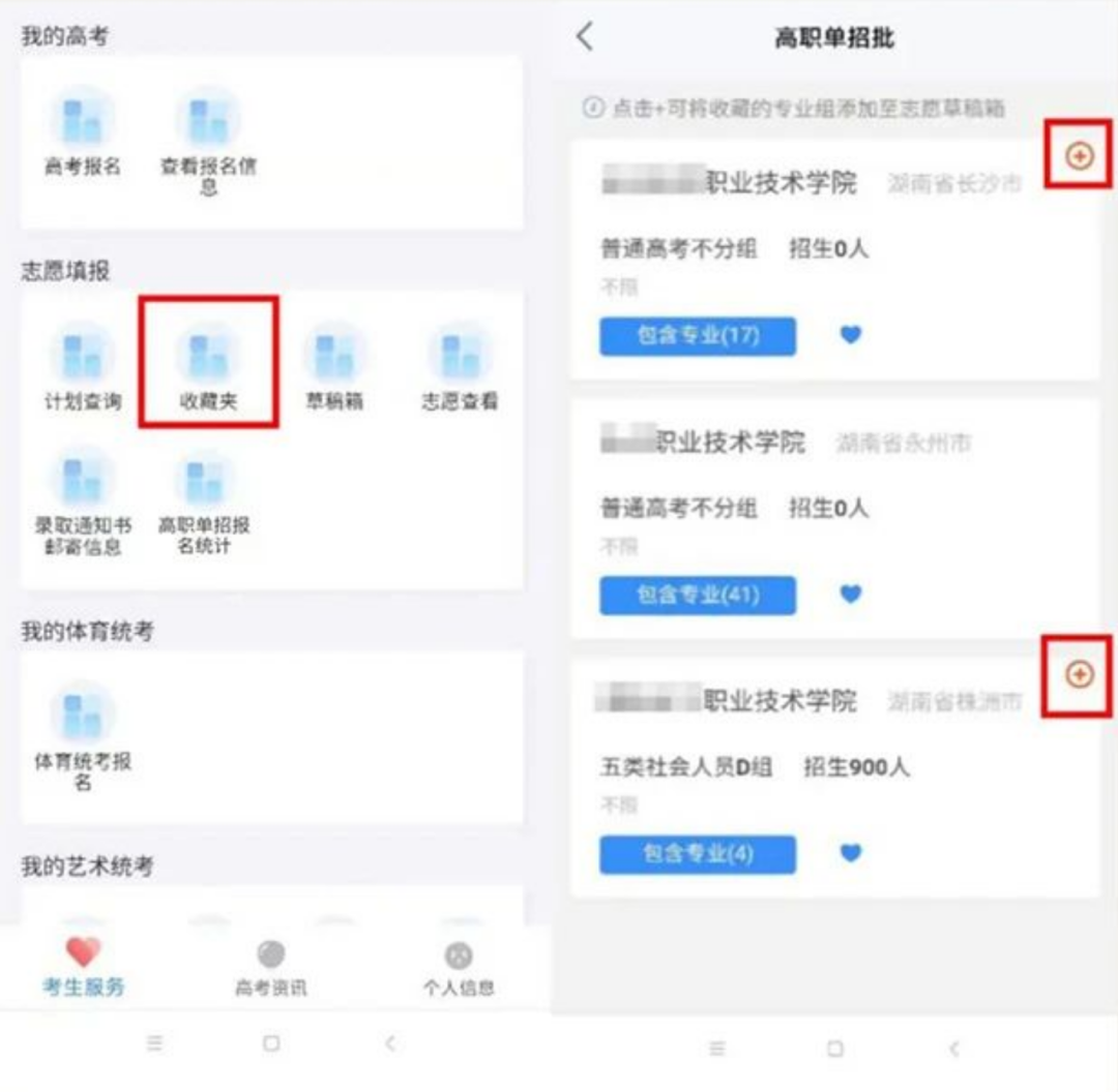方法一:通过【志愿填报】→【收藏夹】,直接添加院校专业组到草稿箱