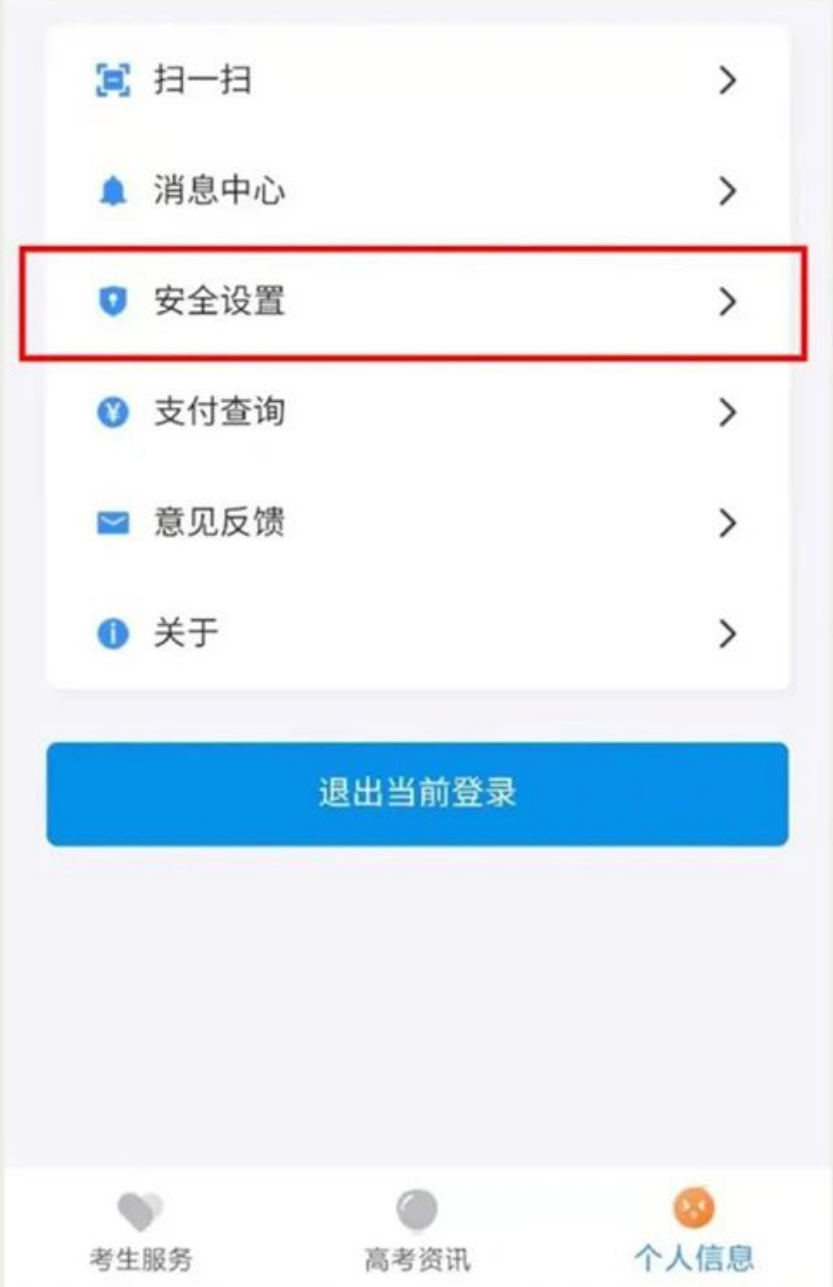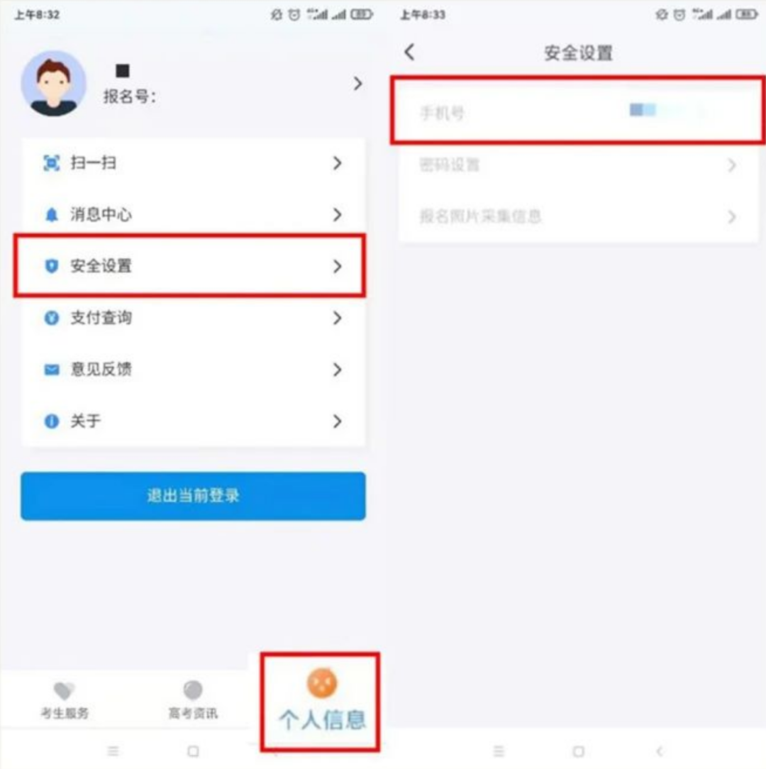 考生须点击右下角【个人信息】→【安全设置】→【手机号】,按要求绑定手机号码。