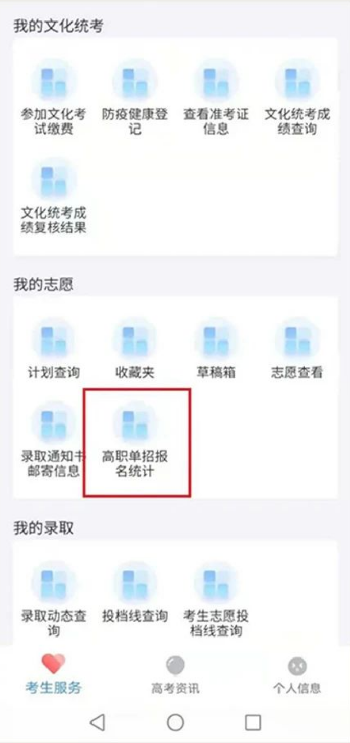 8.考生点击【考生服务】→【高考单招报名统计】,查看当前各高职院校第一志愿第一专业报名考生人数。