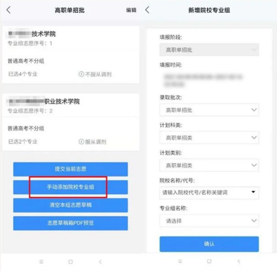 9.考生进入【志愿填报】,可选择下列两种方法之一添加院校专业组到草稿箱。