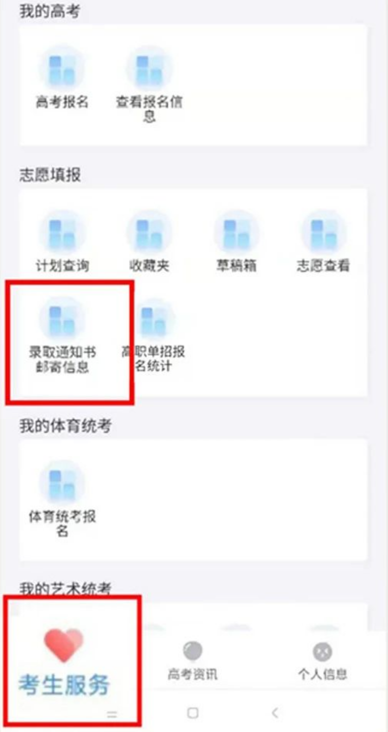 点击左下角【考生服务】→【志愿填报】→【录取通知书邮寄信息】,按照要求填写收件人、邮寄地址、邮政编码等信息。