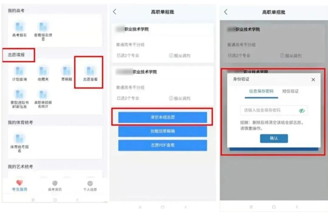 考生输入信息保存密码或手机短信验证码,认证通过后,才能成功清空所填志愿,并看到清空成功的提示。