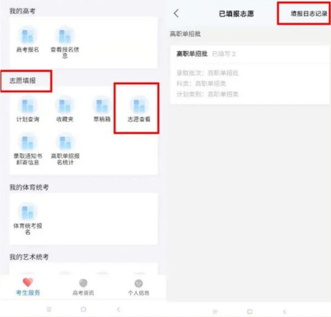 17.考生点击【志愿填报】→【志愿查看】→右上角【填报日志记录】,查看志愿提交保存和清空删除的操作记录