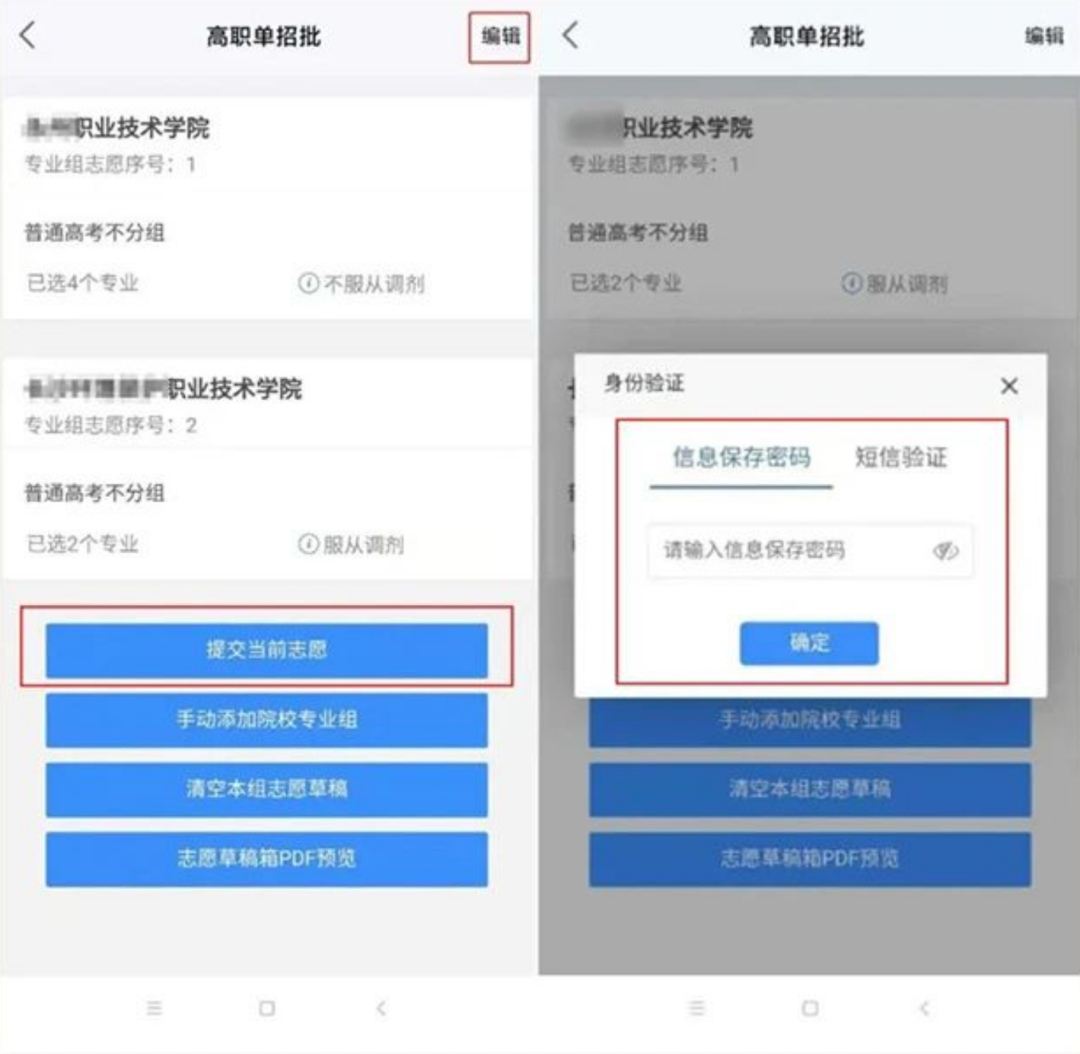 考生输入信息保存密码或手机短信验证码,认证通过后,才能成功保存考生志愿,并看到保存成功的提示