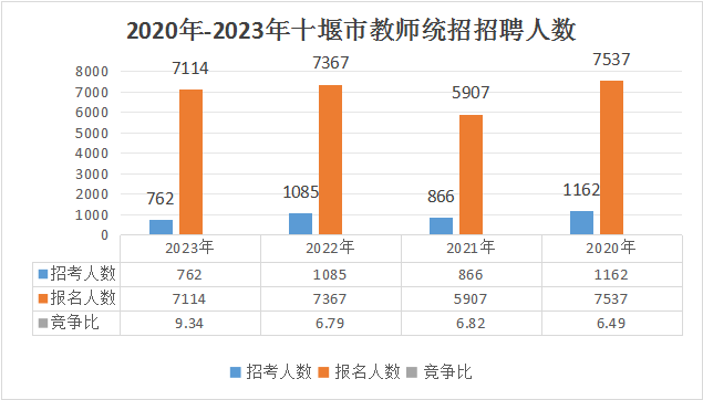 如图所示:20年-23年十堰市招聘人数起伏不定,但竞争比总体呈上升趋势。若24年招聘人数454人左右,同比23年缩招313人!