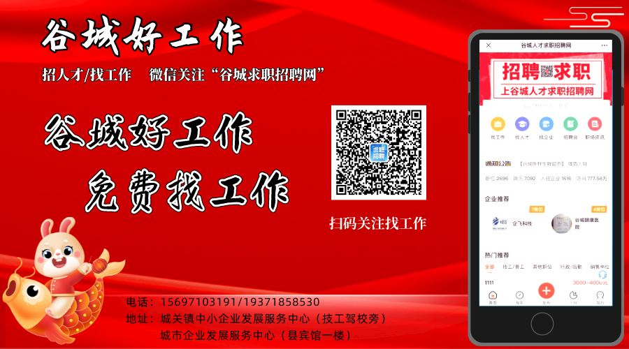 如果您通过我们人才求职招聘网招到人,找到工作,记得告诉我哦,让我知道我的工作还是能帮到您哦,谢谢大家啦。求职招聘就上谷城求职招聘网,专门为谷城人服务的求职招聘平台。