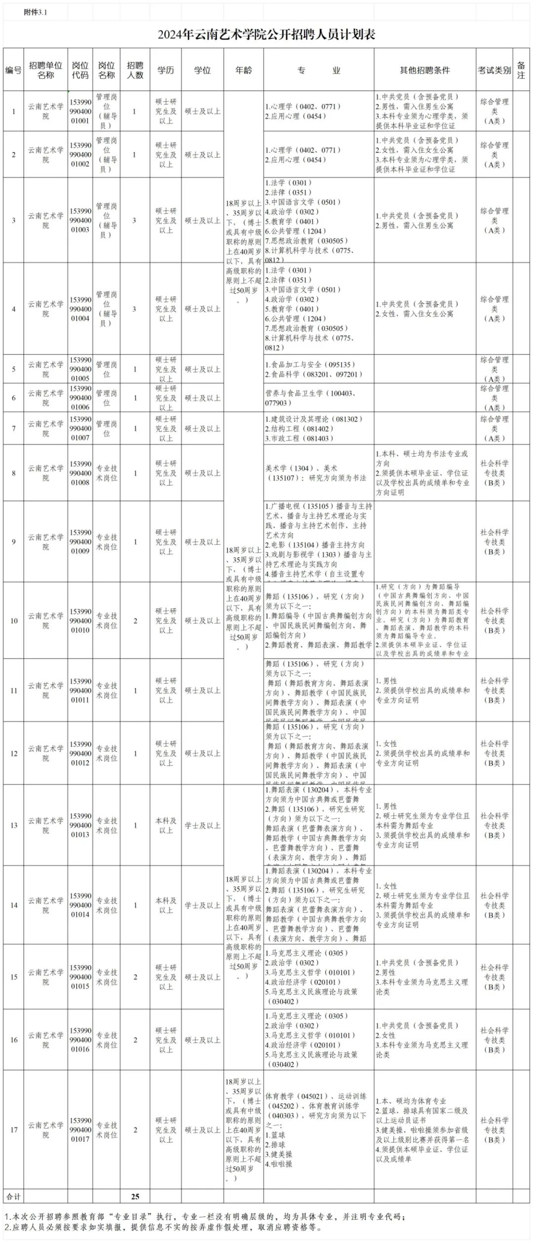 按照《事业单位公开招聘人员暂行规定》(人事部令第6号)《云南省事业单位公开招聘工作人员办法》(云人社发〔2016〕182号)等法律法规,根据工作需要,经云南省教育厅和云南省人力资源社会保障厅批准,2024年云南艺术学院面向社会公开招聘人员 25 名,现将有关事项公告如下: