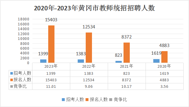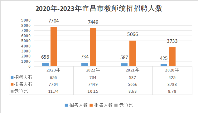 如图所示:20年-23年十堰市招聘人数起伏不定,但竞争比总体呈上升趋势。若24年招聘人数454人左右,同比23年缩招313人!