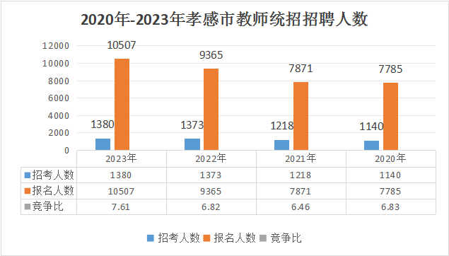 如图所示:20年-23年咸宁市招聘人数总体呈下降趋势,但竞争比却在逐年上升。若24年招聘人数200人左右,同比23年缩招500人!