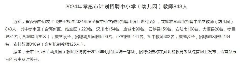 此前孝感市教育局发文:2024年孝感市招聘中小学教师(幼儿园)843人,其中: