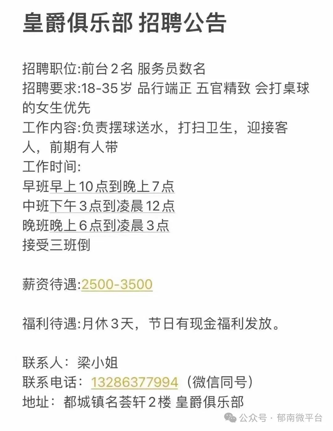 金海岸招楼面部长一名,月薪3500起,看工作能力。楼面服务员或啊姨多名,月薪2700起。厨房打荷一名,月薪3000起。每月休息2天,上班时间下午4点到晚上2点。联系电话13534482788。