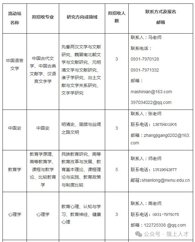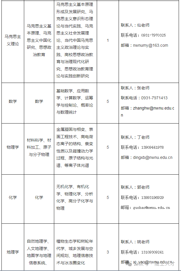 人事处联系人:陈老师;咨询电话0931-7971972;邮箱rscszk@nwnu.edu.cn