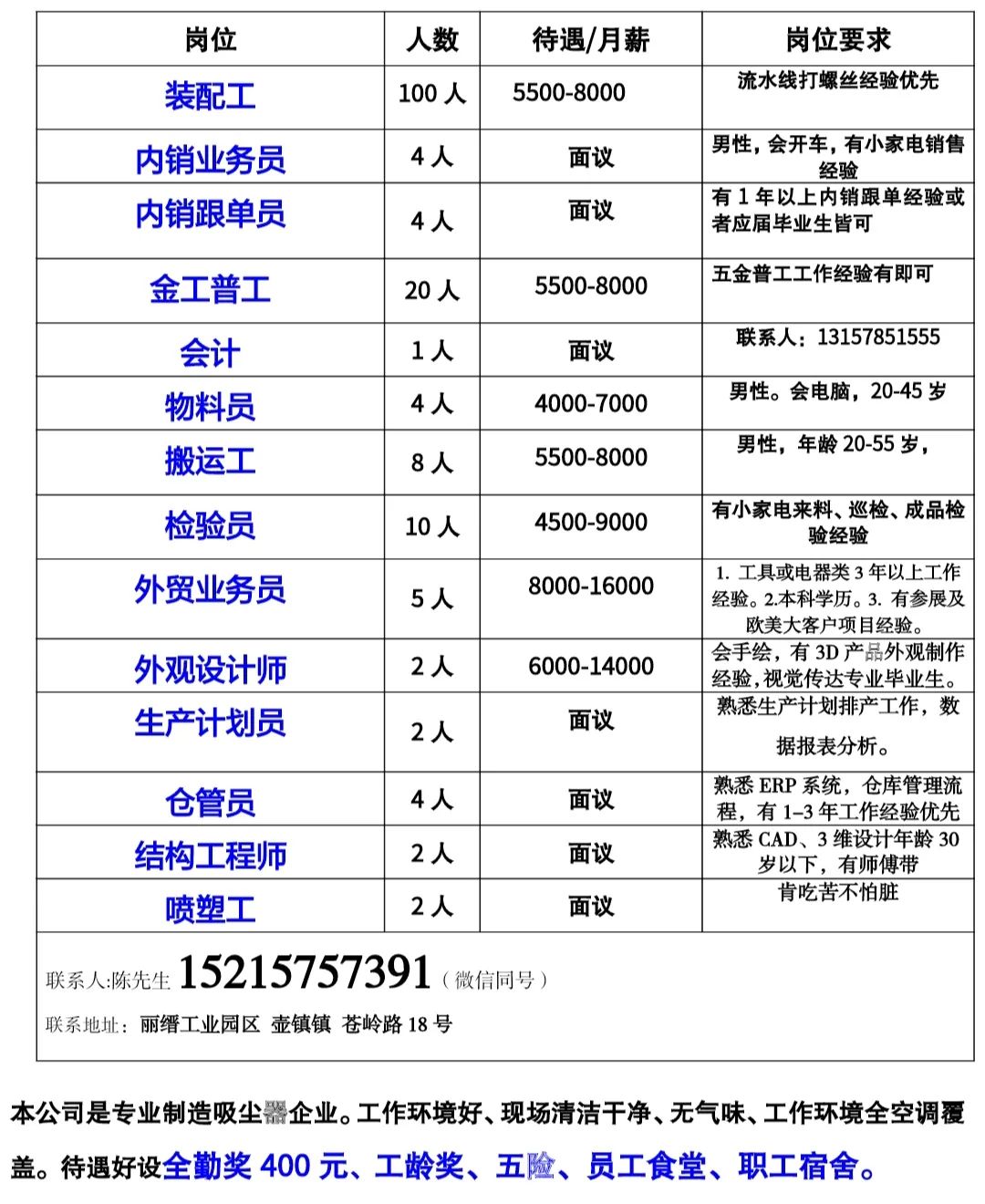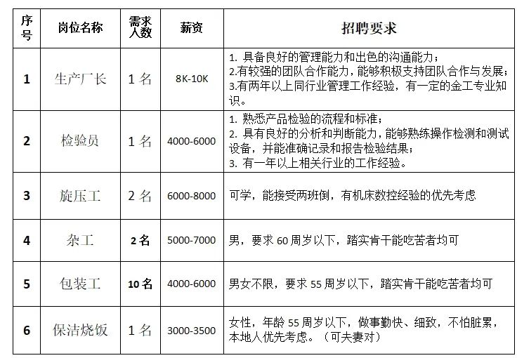 1、男女不限,年龄18-50岁,身体健康,能吃苦耐劳,需适应两班倒工作制。