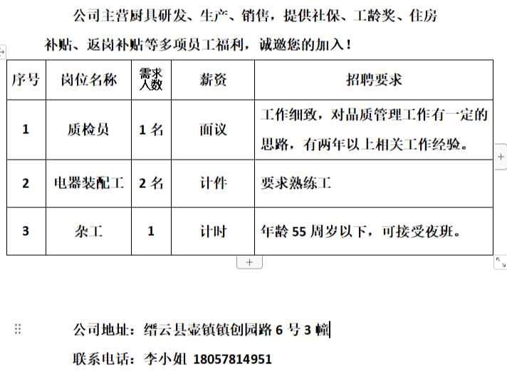 2、初中及以上学历,会写简单的报表,有开机经验优先。