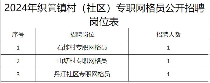 为完善社会治理体系,提升社会治理水平,织篢镇村(社区)拟面向社会公开招聘专职网格员3名(详见附件1),现将有关事项公告如下: