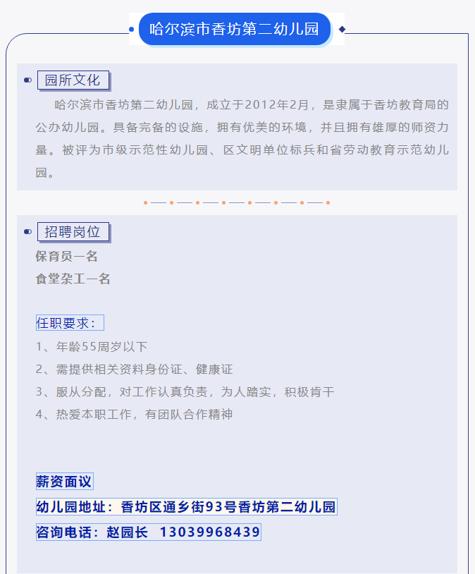 哈尔滨招聘号,哈尔滨招聘,哈尔滨招聘求职的好平台。每日发布考试信息、招聘会、行业动态、人事行政、职场干货、客服、财务销售、快递员、送餐员、外卖员、司机、汽车维修、护理、房产中介、餐饮招聘、普工、保洁、保姆月嫂等工作招聘信息,欢迎您的关注! 哈尔滨市香坊第二幼儿园,成立于2012年2月,是隶属于香坊教育局的公办幼儿园,是一所设备齐全、环境优雅、师资力量雄厚的市级示范性幼儿园、区文明单位标兵、省劳动教育示范幼儿园。