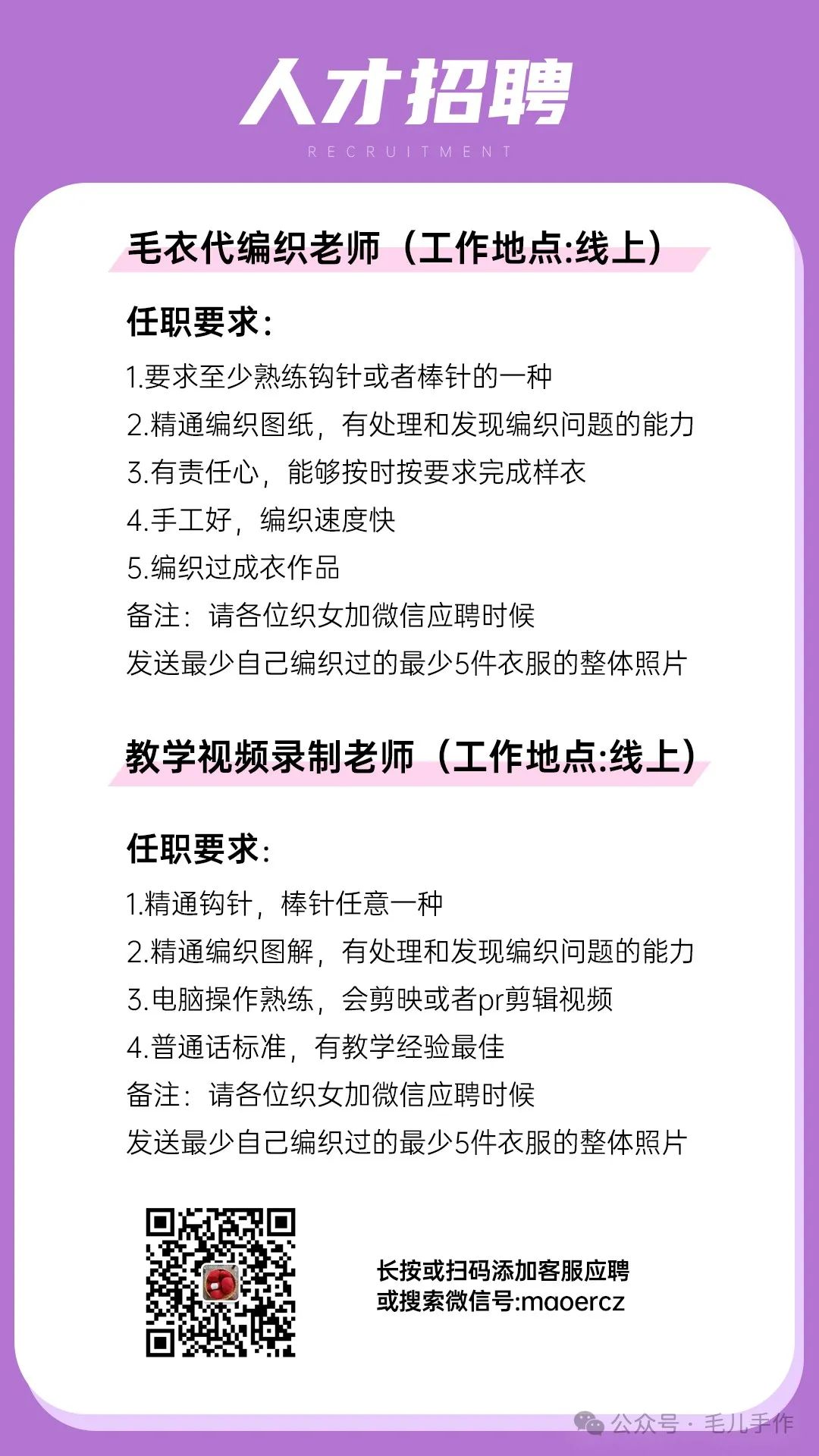 招聘职位有毛衣代编织老师,教学视频录制老师,具体要求在下面图片中,如果你符合要求,请添加微信或者搜索微信号(maoercz)报名,等你来哟~