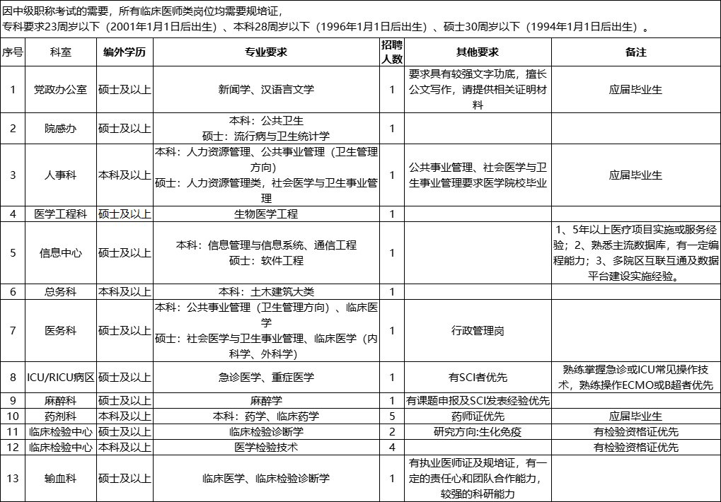 2.本科要求第一学历本科(除护理等特殊专业外,不包括自考、成人教育或专升本等有专科经历的学历),参加全国普通高等学校招生统一考试入学的本科毕业生,具有本专业全日制统招本科学历,有学位证书。除特殊岗位外,临床类专业需有规培证。