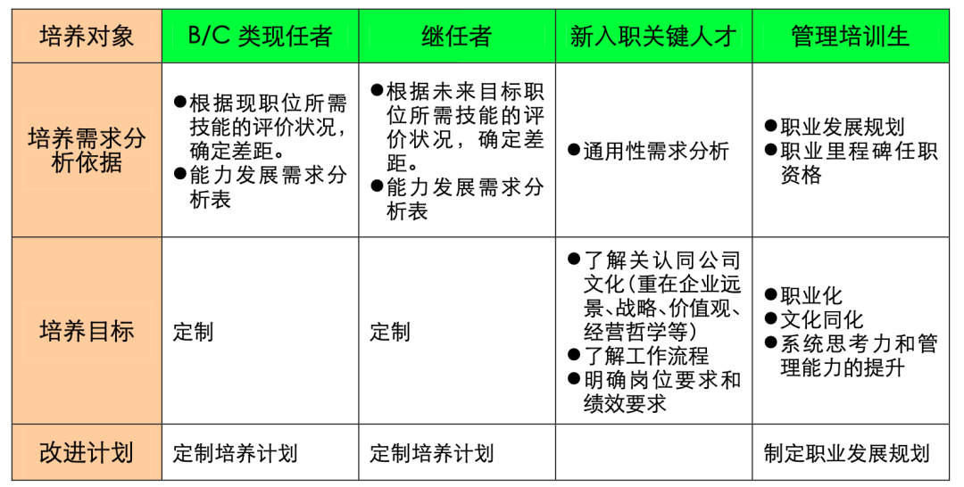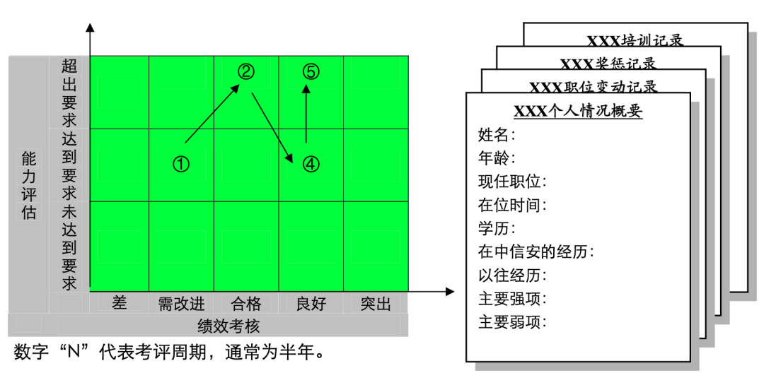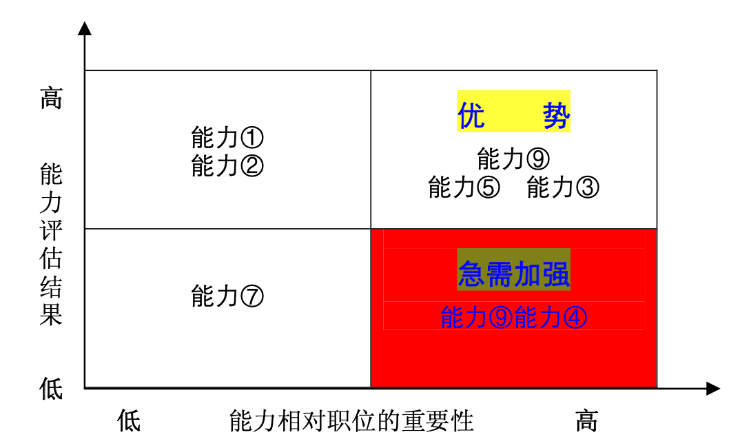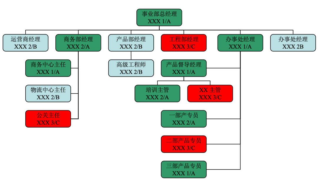 b) “字母/数字”代表该岗位人员的任职状态和发展潜力。数字:1-胜任力表现突出,2-胜任力表现良好,3-胜任力表现一般,4-胜任力表现较差;字母:A-现在可以提拨,B-还需要培养,C-现职位不很适合暂无发展潜力。