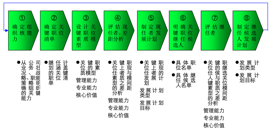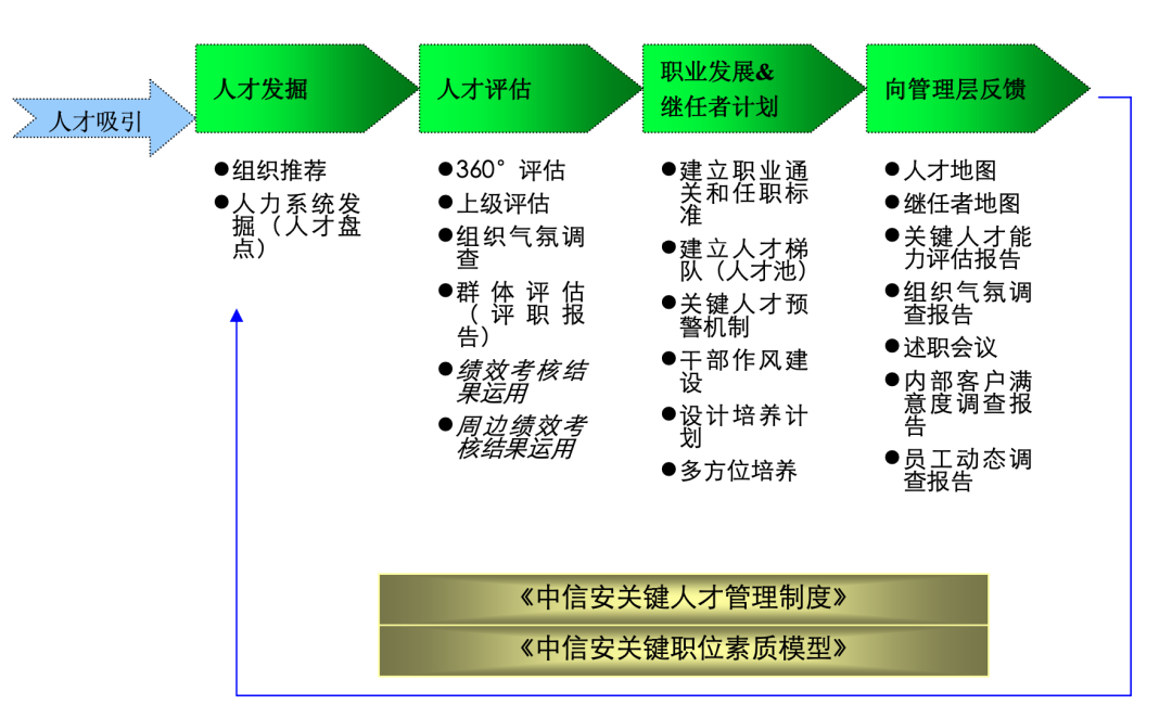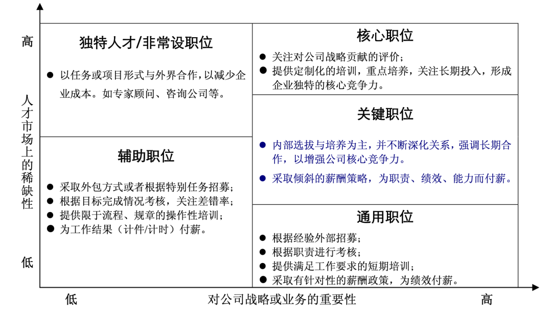 公司的业务发展和战略升级,需要公司核心能力的驱动和支撑。而公司核心能力的载体是关键职位上的人才,对关键人才的识别、保有和提升,就是对公司核心能力 的保有和提升。如何系统地管理关键人才,如何有计划的提升关键人才的能力,如何进行人才储备以满足业务发展需要,如何进行继任者培养以减少关键职位人才流失或缺位而带来的影响等,是我们面临的课题。通过构建、落实和持续完善关键人才管理体系,以达到如下目的:1. 锻造一支高素质、高境界、高领导力的干部队伍,和一支高素质的专业人才队伍。2. 明确和落实关键人才责任机制,促进关键人才管理工作科学化和规范化。1. 这些职位与组织的关键能力紧密相连,且对组织的未来发展起着至关重要的作用;2. 这些职位较为适合从内部培养和选拔,而非外部招聘;4. 根据公司业务发展、组织架构的变动,并键职位可能发生变化。1. 对人才的评估坚持从四个方面进行评估:企业文化认同度、人品与职业操守、能力(管理能力和专业能力)、业绩。A 类人员:考虑加速其发展步骤,并加快对该岗位的继任计划;B/C 类人员:给予有针对性的培训,帮助其进一步提升其业绩和能力水平;D 类人员:给予警告,甚至淘汰,在重点提供业绩和能力辅导的同时,必须加快对该 岗位的继任计划。人才地图可直观反映现任岗位上人员与岗位要求匹配情况和发展潜力。a) “XXX”代表现岗位上人员的姓名