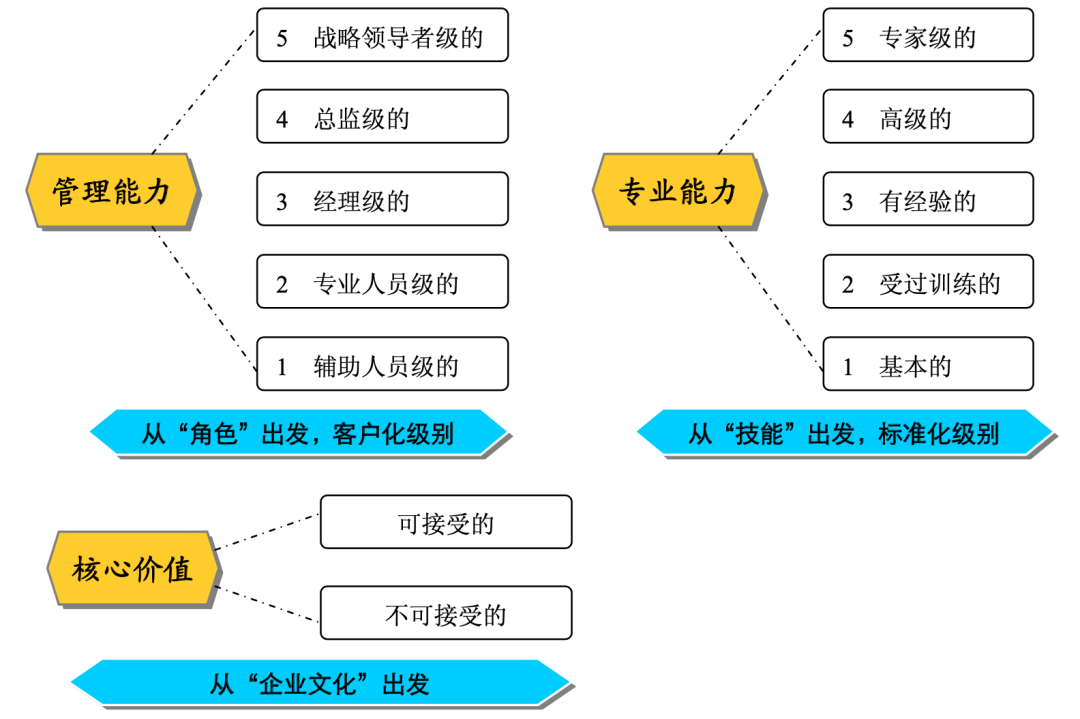 b) 素质曲线(管理能力曲线、专业能力典线、价值观曲线) c) 素质分析矩阵