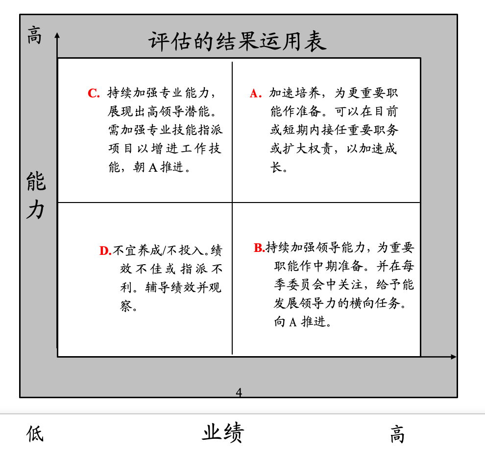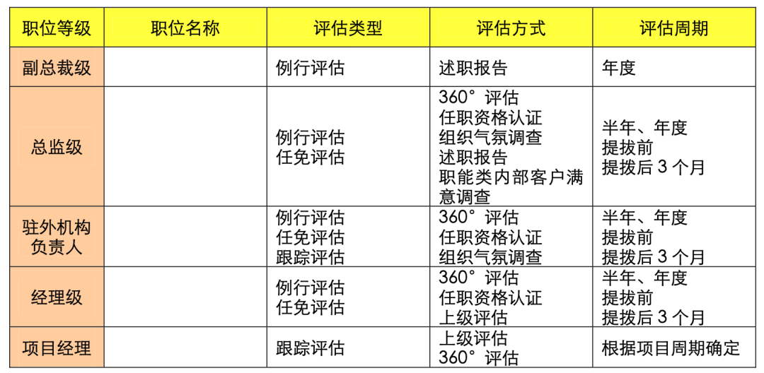 1. 作为选拔、留人、调岗等人事决策的依据。(工具见:前面“第一部分 总体思路介绍”中的《评估结果运用表》)1. 作为选拔、留人、调岗等人事决策的依据。(工具见:前面“第一部分 总体思路介绍”中的《评估结果运用表》)3. 作为培养需求分析的依据。(工具见“第六部分 人才培养中”的《能力发展需求分析矩阵》)十三 分层分类进行评估,且评估工具、评估侧重点不同。1. 总监级、驻外机构负责人的评估模板