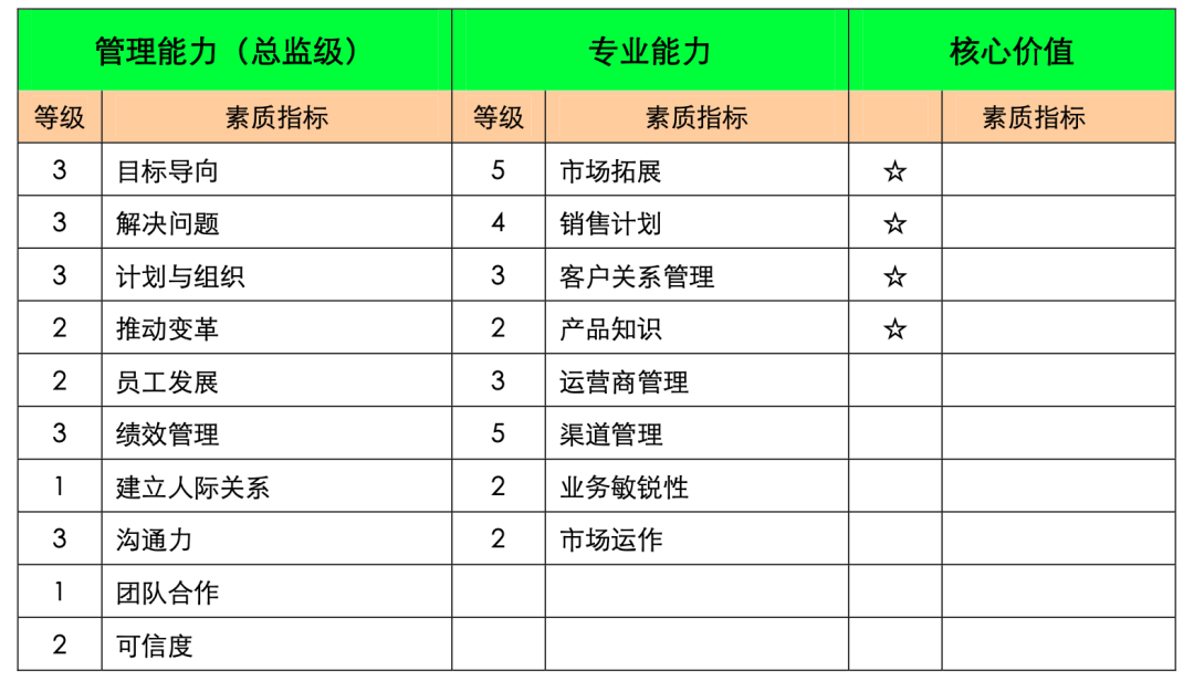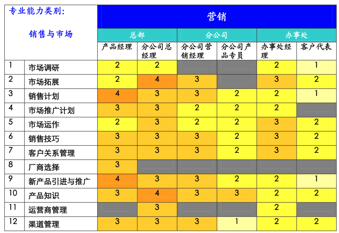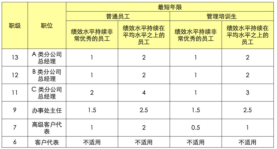 2. 明确各职业阶梯对能力上的要求(见《关键职位素质模型》)。 i. 案例,下面的表格展示的是一个绩效水平持续非常优秀的员工以及一个绩效水平 持续在平均水平之上的员工分别在销售执行/销售网络管理类职位中的升迁所需 的最短年限示例1. “能力-绩效”评估结果矩阵中相限 B、C 内的现任者(高能力中等绩效、高绩效中 等能力两类人才。见本草案第六条:《评估结果运用表》)1. 被评估人的优势在于:能力 3、能力 5、能力 9;2. 被评估人急需加强的能力有:能力 4、能力 9。这两项能力也是我们制定培养计划时所重点考虑的。本文仅做分享,并无商业用途,如有侵权请联系小编删除。