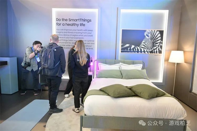 除了手机,三星还展示了如何通过SmartThings生态系统,为我们打造健康、智能的生活环境。在三星的展台上,有一个模拟家居环境的区域,展示了各种智能互联设备如何协同工作,为我们提供更便捷、更舒适的生活体验。比如智能互联的灯具可以根据你的需求自动调整亮度和色温,智能开关则能帮你轻松控制家中的电器设备。而SmartThings还能提醒你按时服药、追踪你的运动情况,让你的健康得到全方位的守护。