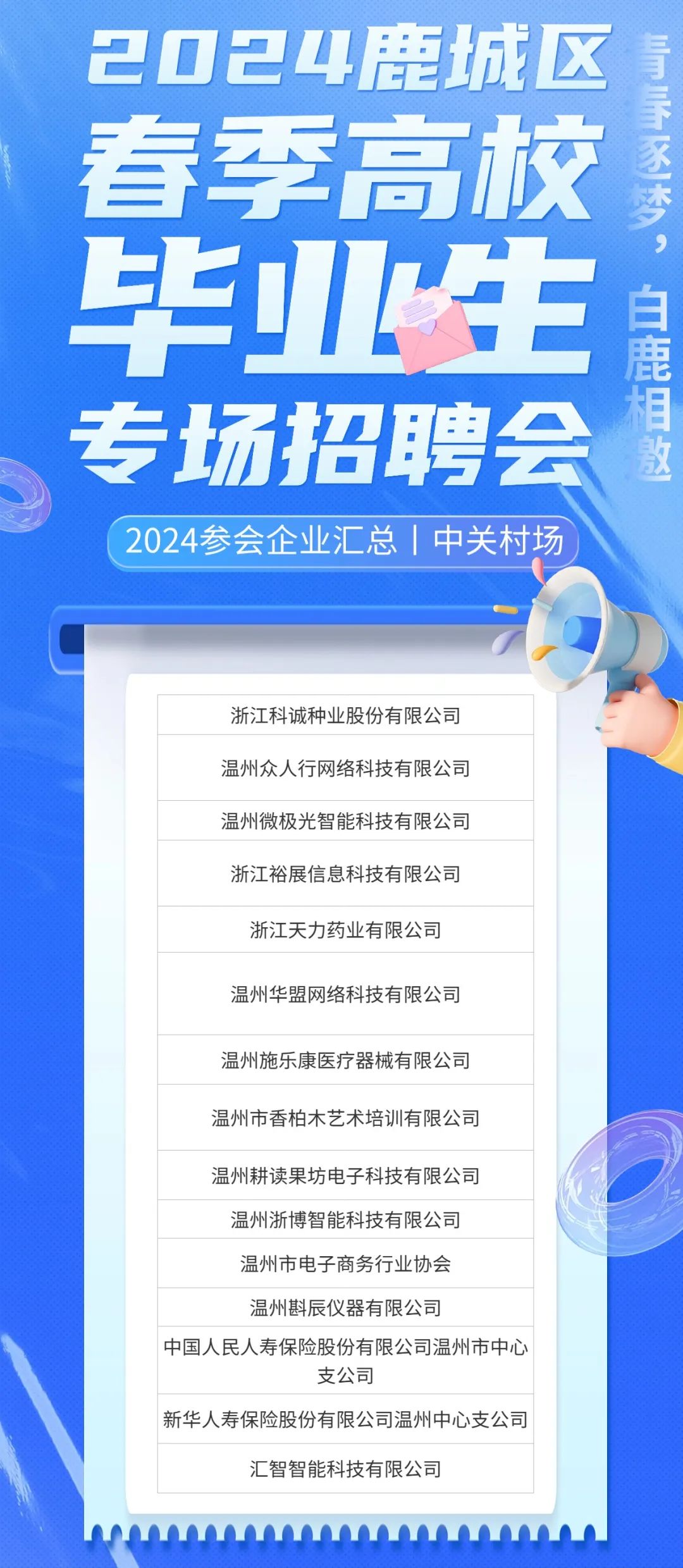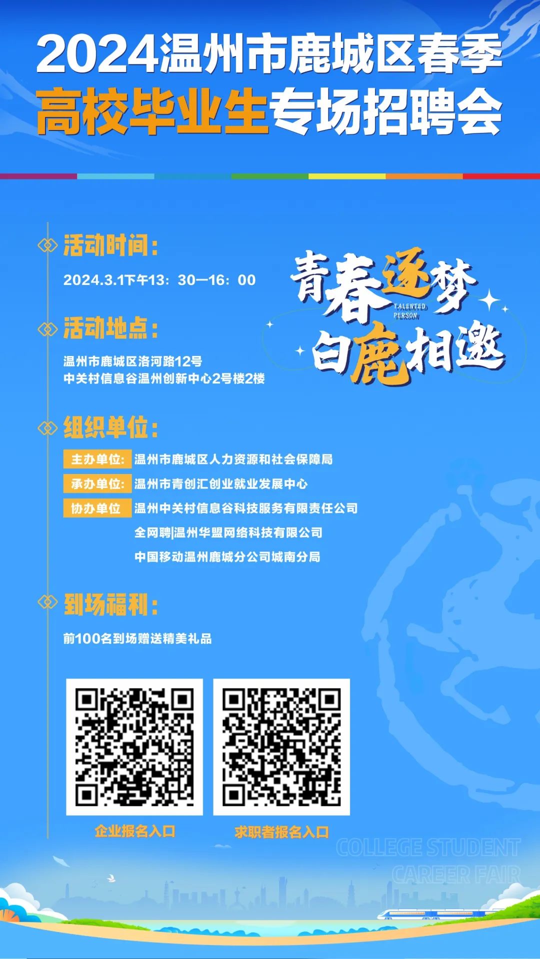 2024鹿城区春季高校毕业生专场招聘会3月1日即将震撼来袭。政府引路,优质企业汇聚,为你开启一扇通向职场的大门,点燃你的求职激情,让你的求职之路畅通无阻,现场更有惊喜好礼,待你揭秘!
