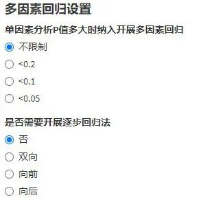 我们可以选择逐步回归法开展多因素回归、我们自己可以设置,根据P值来判断哪些单因素回归的结果将选择进来开展多因素回归
