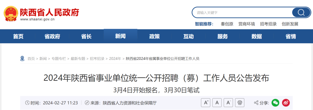 近日,陕西省人民政府发布2024年陕西省事业单位统一公开招聘(募)工作人员的公告。以下为公告详情↓↓↓