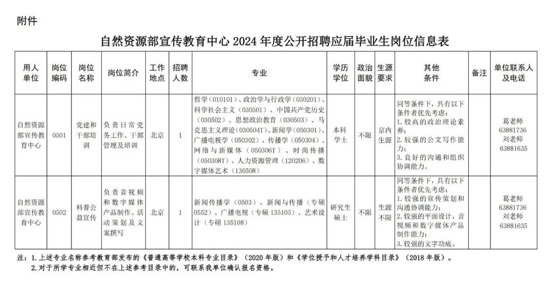 详见《自然资源部宣传教育中心2024年度公开招聘应届毕业生岗位信息表》(点击阅读原文即可下载)