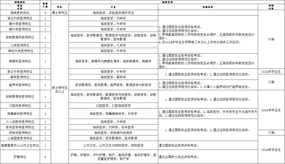 9.具体招聘专业、学历、资历等要求详见《岗位表》。其中,博士研究生不受岗位限制,临床、医技、实验室科研等相关专业均可报名。博士、硕士毕业生为临床医学专业(符合相关科室需求专业方向)的均可报名。