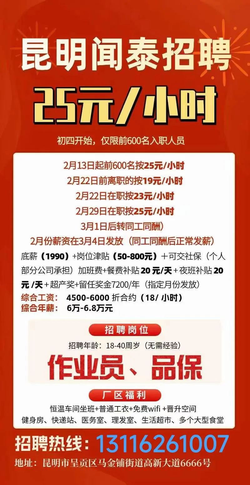 2、公司食堂:中式快餐、 自选餐、清真窗口、各类特色小吃、麻辣烫等3、福利活动:节日礼品、年会、拓展、卡拉 OK 赛、 工会活动等4、生活配套齐全:超市、理发室、休闲茶吧、篮球场、员工活动中心等张何池:18788581290、13116260208公司官网:http://www.wingtech.com/cn工作地点:昆明闻泰通讯有限公司(昆明市呈贡区马金铺高新大道6666号)温馨提示:请在求职时提高警惕。凡涉及收取各种不合理费用、要求抵押身份证、缴纳各类押金、以丰厚报酬诱导到省外或国外就职培训、超出市场行情高薪招聘、不面试就录用等情况,需谨慎辨别,谨防上当受骗。